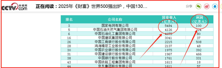 放到全球范围内比较,国家电网在2025年《财富》世界500强中位列第三位,2025年国家电网营收5484亿美元,净利润100亿美元,并已连续6年进入《财富》世界500强前三。